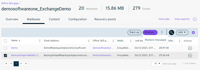 Selecting the Restore Messages option displays all the items that are being backed up for the user. However, selecting the mailbox restore option will restore all data backed up for the selected user.