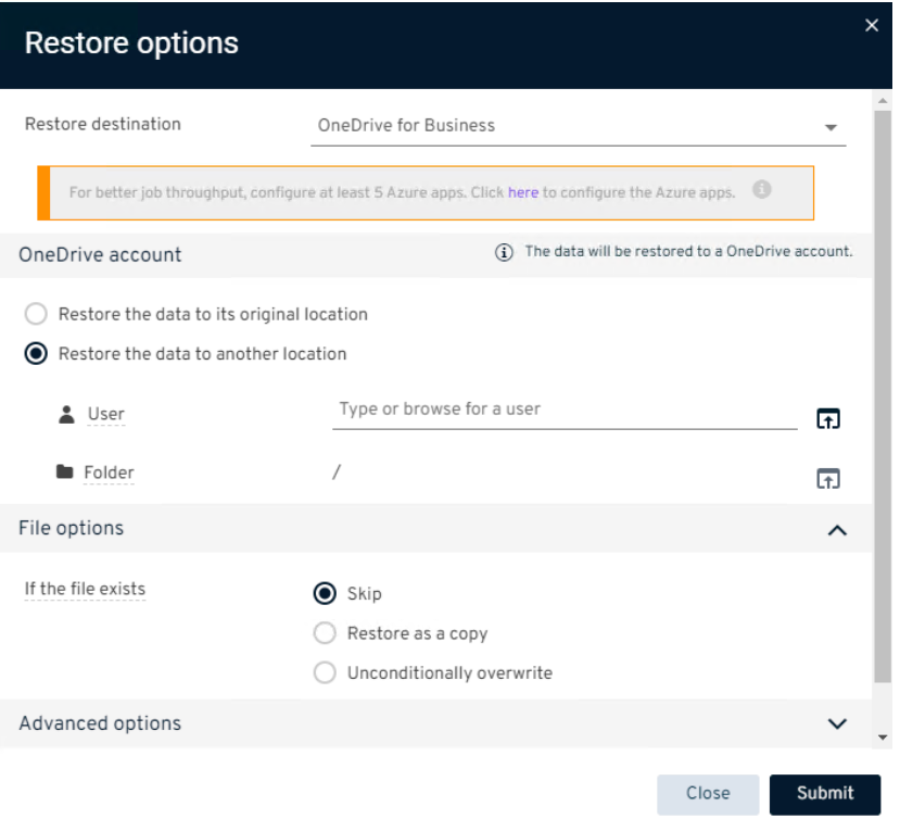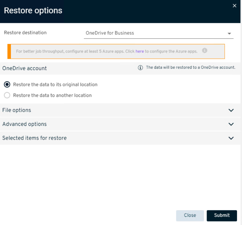 • One Drive For Business→ Select this option for In-place and Out of Place restores to One Drive.